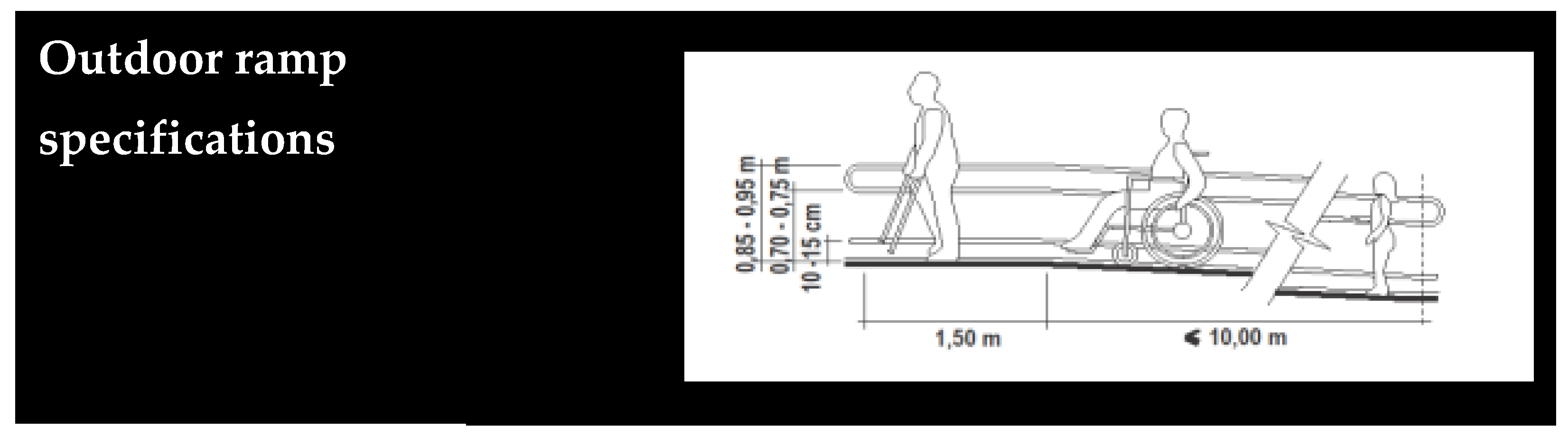 21]. At the national level, Cyprus Regulation 61HA establishes requirements for accessibility and safety in the built environment, specifying criteria for pathways, slopes, signage, and tactile guidance [
