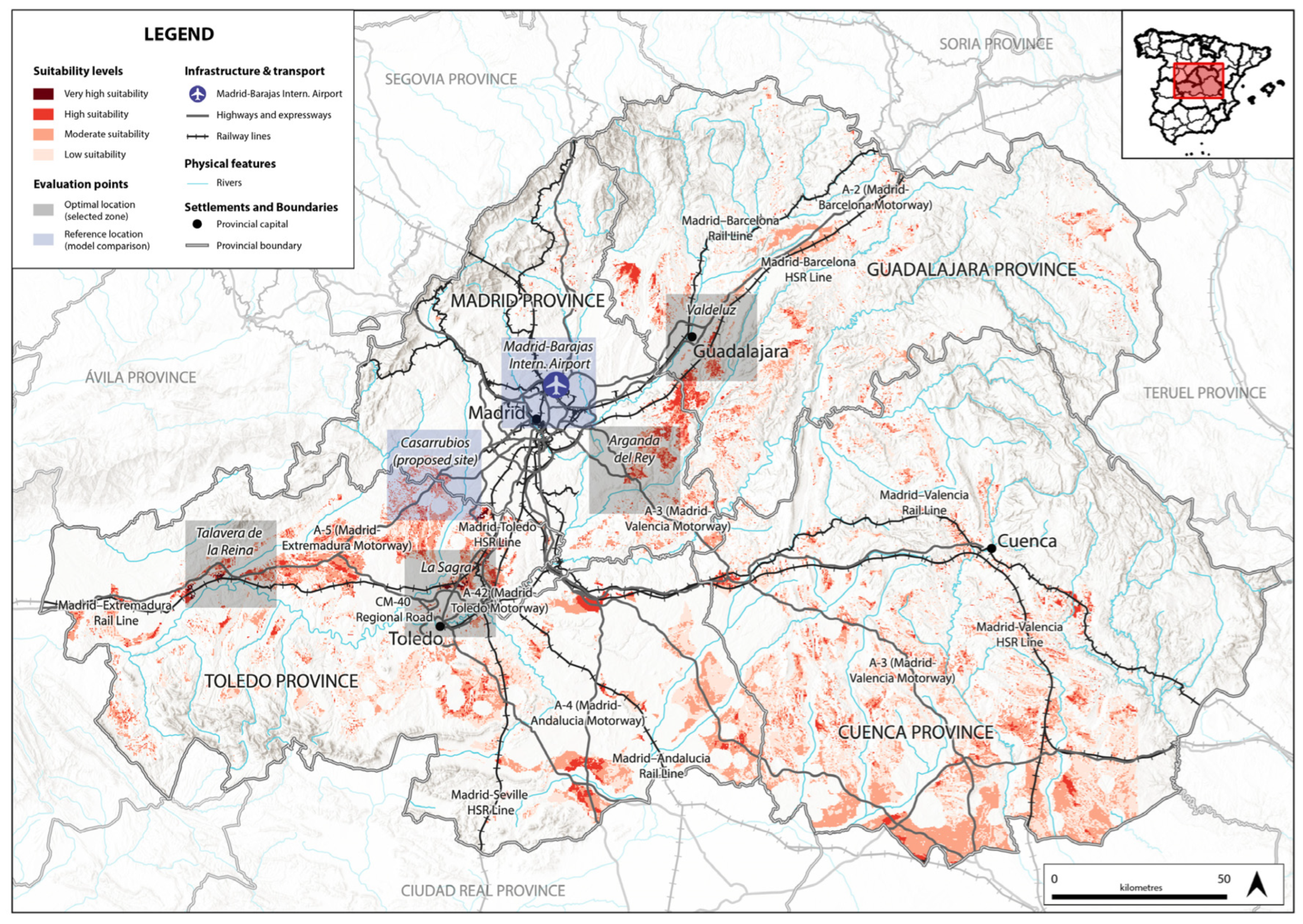In relation to this, the present study asks where and how a new airport in the Madrid region could be optimally located, integrating functional, environmental, and territorial criteria.