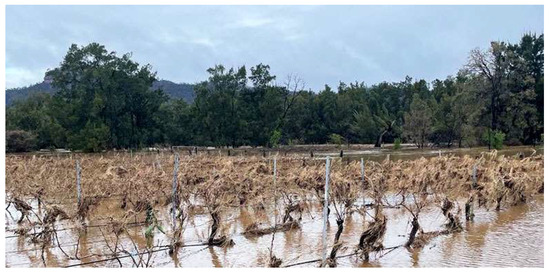 The Wollombi Brook flooding in Broke/Fordwich GI, 2 August 2022. Source: https://www.wineselectors.com.au/selector-magazine/wine/a-flood-of-support-for-hunter-wine-country (accessed on 1 June 2025).