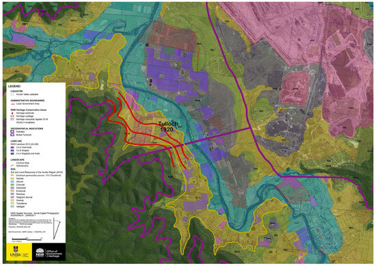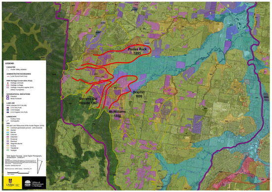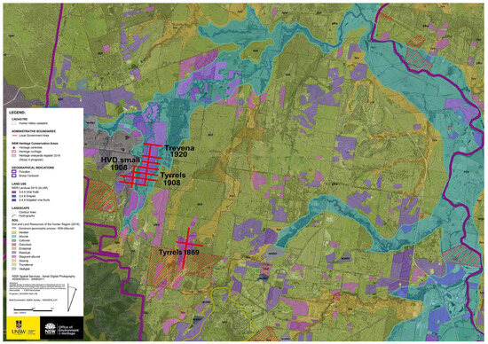 The Lower Hunter Valley is a major wine-producing region in NSW, Australia, and a prominent example of knowledge-intensive agriculture, known for its scenic landscapes and premium food production [40]. A fine-grained landscape mosaic is the result of well localized and utilized physiotopes by viticulture, forestry, and pastoralism [41]. The oldest surviving vineyards in Australia were planted here in the early 1800s using rootstocks imported from Europe, prior to the grape phylloxera crisis [26,42]. These vineyards contain vine genomes that are unique to Australia and mark the birth of the national wine industry, which has significantly shaped the region’s history and socio-economic development. The relatively recent establishment of agriculture in the area offers a unique opportunity to retrace landscape evolution and assess its continuity and resilience over time (Figure 1).