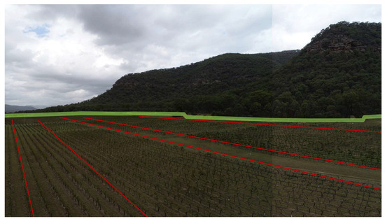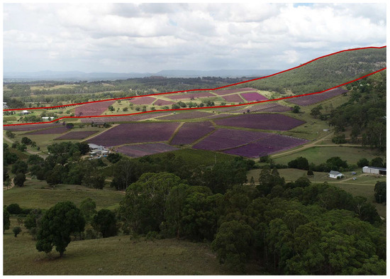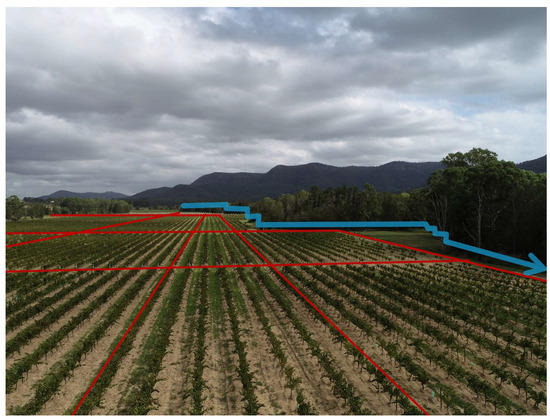 Foot Slope (foothill ecotone) FALT2—This type occurs on gently sloping grounds at the base of mountain ridges, above creek lines, with elevations up to 100 m and slope gradients lower than 10% (Figure 6). Soils are shaped by transferral processes, consisting of deep deposits eroded from upslope areas. Well-drained red–brown earths support both red and white wine production [45].