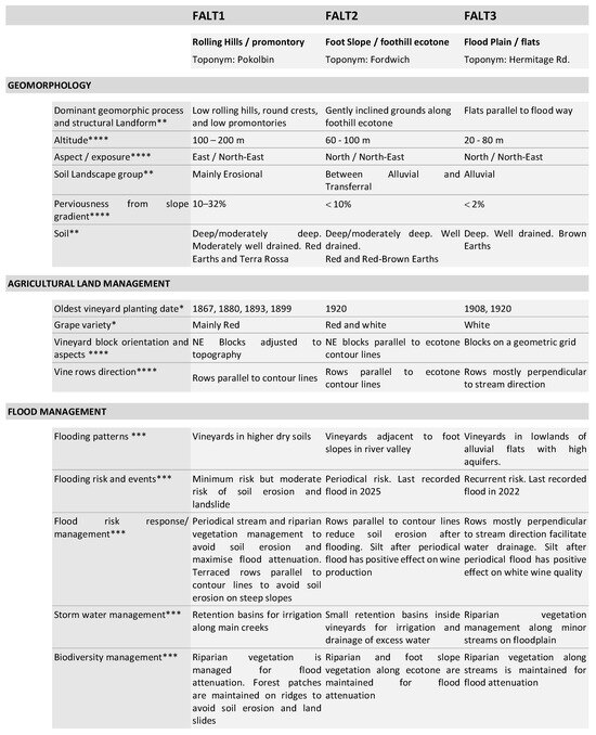 In addition to the qualitative data from farmers’ interviews and the Hunter Valley Heritage Vineyards Register database [39], the study examined several key factors influencing flood adaptation. These were grouped in three main categories of indicators, cross-referenced to identify landscape types with similar flood responses. These include: