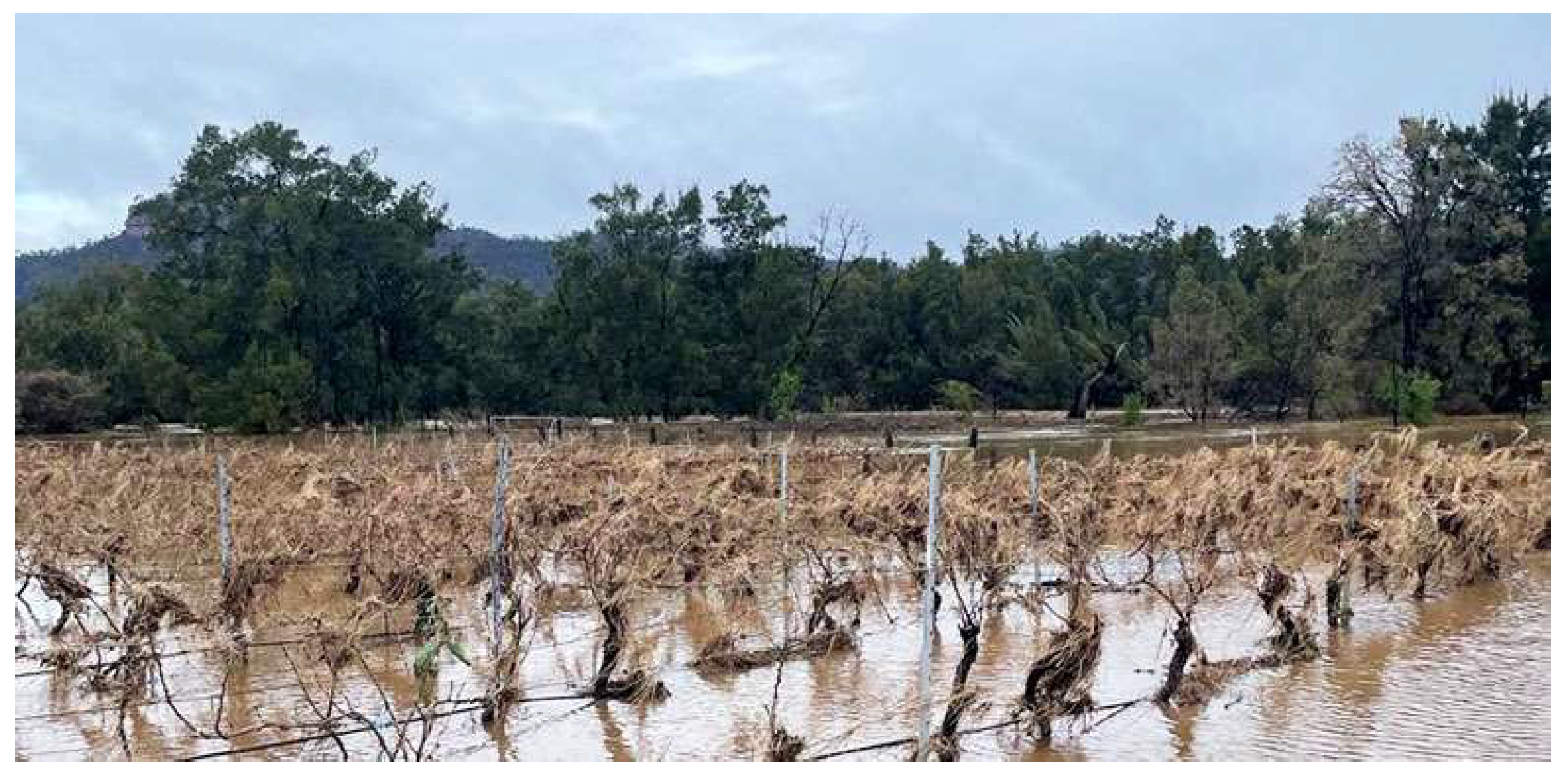 - Skinner, W.; Drew, G.; Bardsley, D. “Half a flood’s no good”: Flooding, viticulture, and hydro-social terroir in a South Australian wine region. Agric. Hum. Values 2023, 40, 549–564. [Google Scholar] [CrossRef]