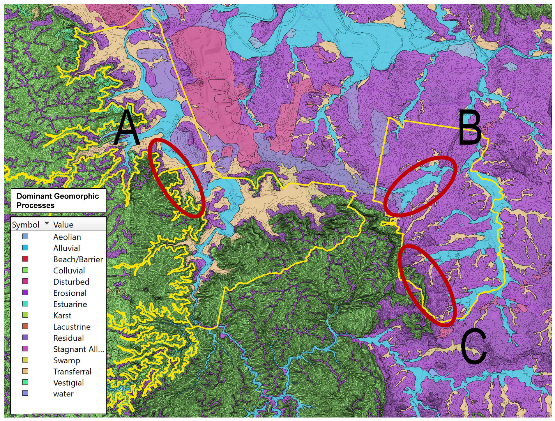 - Desktop research: Compilation of geospatial datasets, including high-resolution aerial imagery (ADS40/50GSD) and the Soil and Land Resources Report 2018 that identifies over 460 soil and land types in the Hunter Valley, detailing key DEM-based indicators, such as landforms, land cover, geomorphic processes, soil characteristics, and erosion patterns, to support landscape-scale environmental analysis.