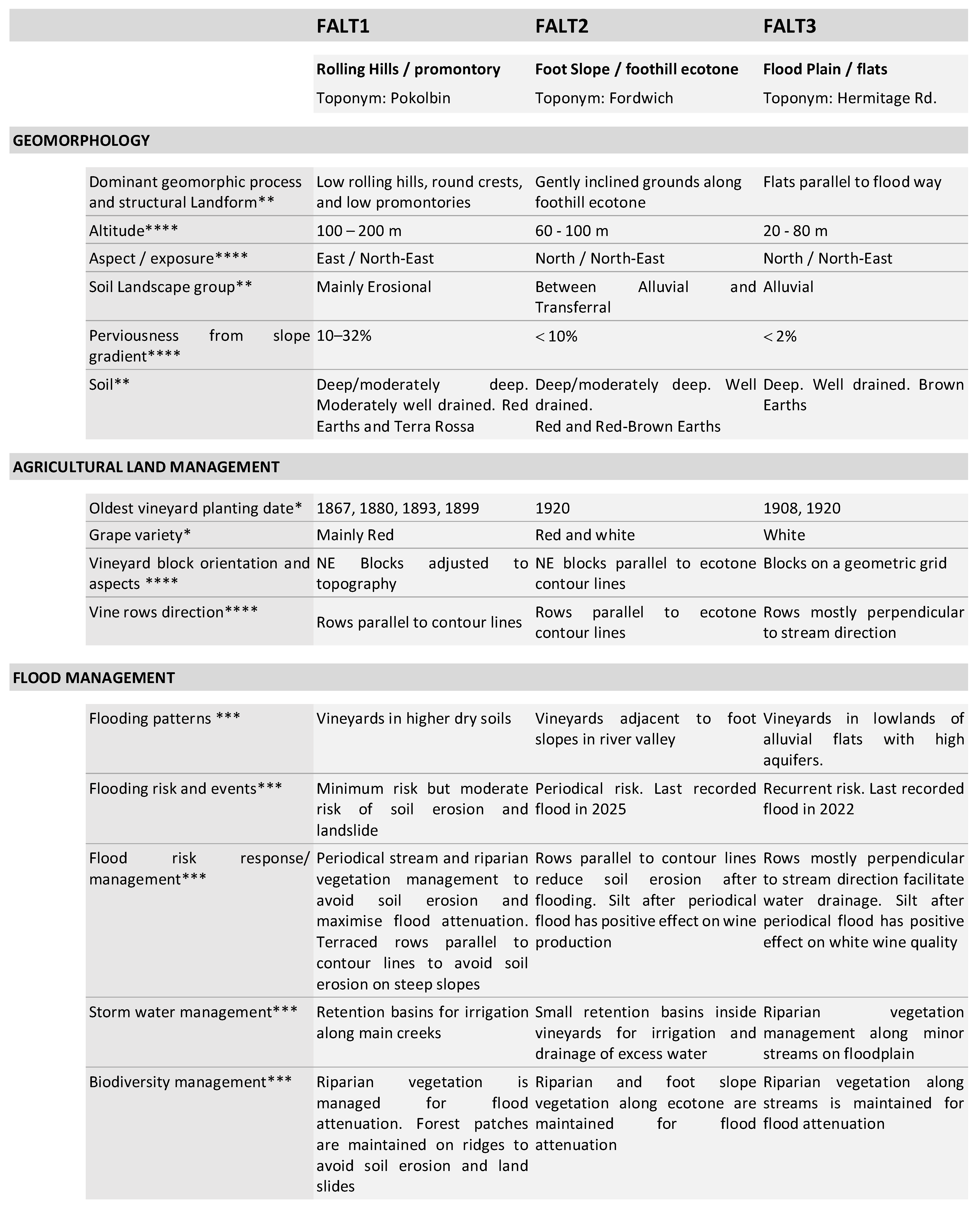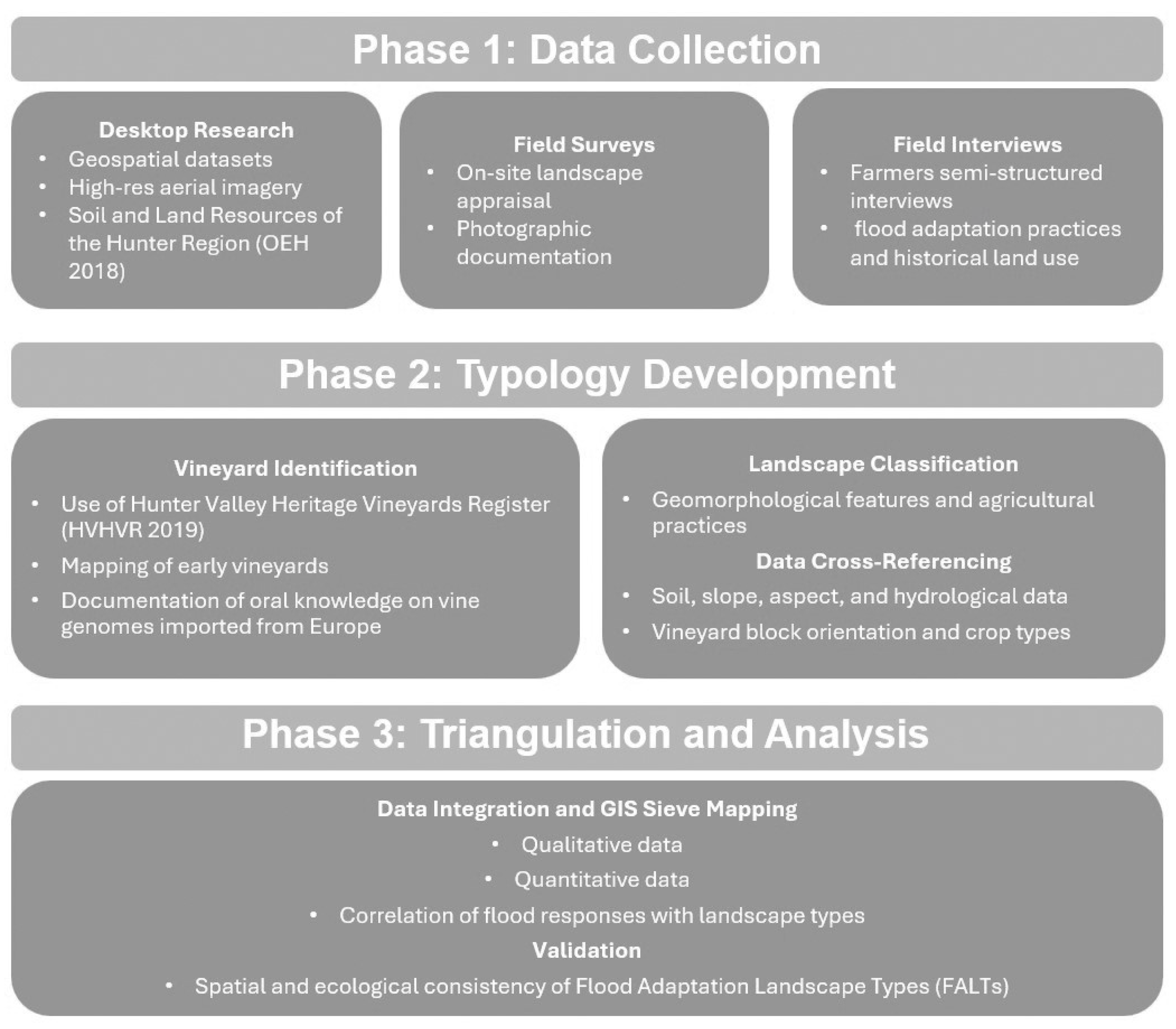 - Identification of long-standing vineyards using the Hunter Valley Heritage Vineyards Register [39], which maps the continuity of early vineyards and documents oral knowledge about vine genomes first imported from Europe. This heritage, passed down through generations of farmers, represents a valuable form of intangible environmental knowledge that contributes to flood resilience in the region.