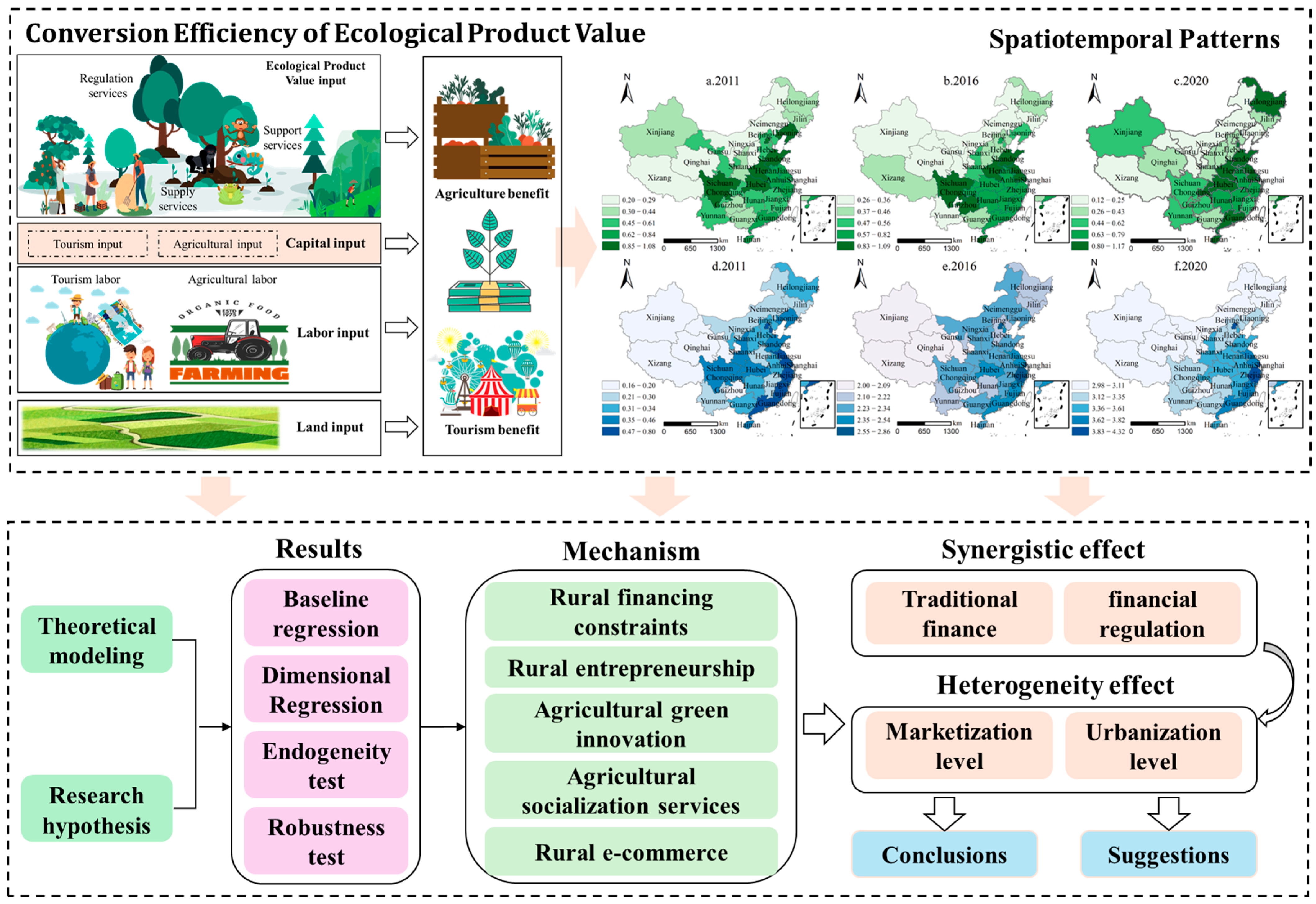 In this regard, digital finance—an emerging financial innovation integrating digital technologies with inclusive financial services—has created new opportunities for overcoming the traditional barriers to EPV realization. With its features of efficiency, accessibility, and inclusiveness, digital finance can reduce transaction costs, ease financing constraints, and expand market access for ecological industries. Existing studies have explored its impacts on rural financing [6], green productivity [7], entrepreneurship [8], and innovation [9]. However, systematic investigations into how digital finance affects the CEEPV remain limited.