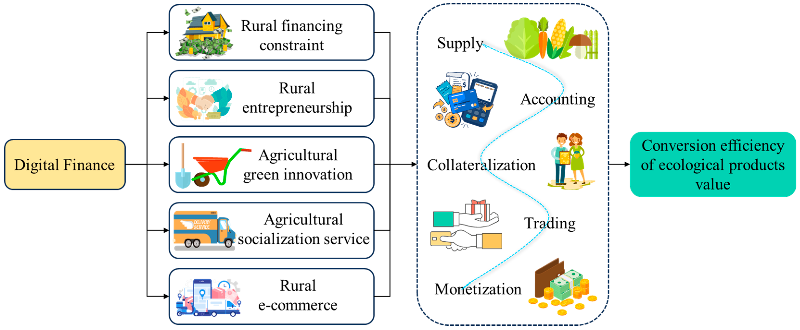 Rural financing constraints: Traditional financial institutions often fail to meet the financing needs of farmers and agricultural enterprises in remote areas. Digital finance, through mobile and internet platforms, has expanded access to financial services in such regions [31]. Moreover, by leveraging big data and AI, these platforms can better assess creditworthiness and reduce information asymmetry, thus lowering risks and easing borrowing processes [6]. This improved access to finance enhances investment in agriculture and ecological product production, increasing the efficient use of ecological resources [23,32]. In addition, Wang (2023) [33] notes that digital finance encourages long-term investment in sustainable rural development, thereby improving the CEEPV.