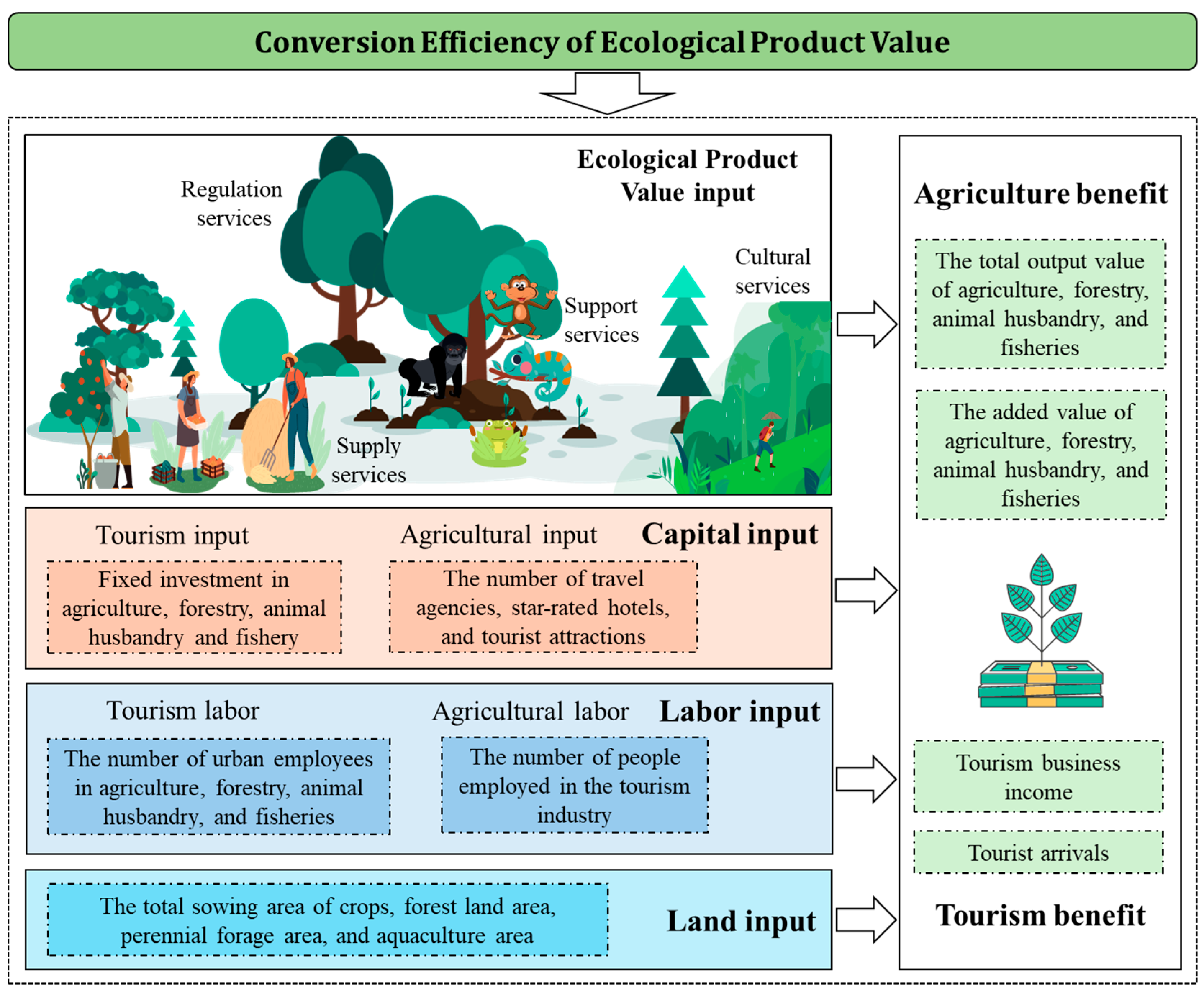 From the perspective of welfare economics, the realization of EPV lies in internalizing the positive externalities of ecosystems into measurable economic benefits. While ecological compensation mechanisms can offset ecological opportunity costs, the effectiveness of EPV realization also depends on how efficiently ecological resources are converted into tangible economic and ecological outcomes. To capture this efficiency dimension, scholars have begun to focus on the conversion efficiency of ecological product value (CEEPV), which measures the input–output performance of ecological resources integrated into production systems [4]. CEEPV is not only an indicator of ecological value realization but also reflects the effectiveness of ecological capital allocation and its implications for equity, regional development, and sustainability.