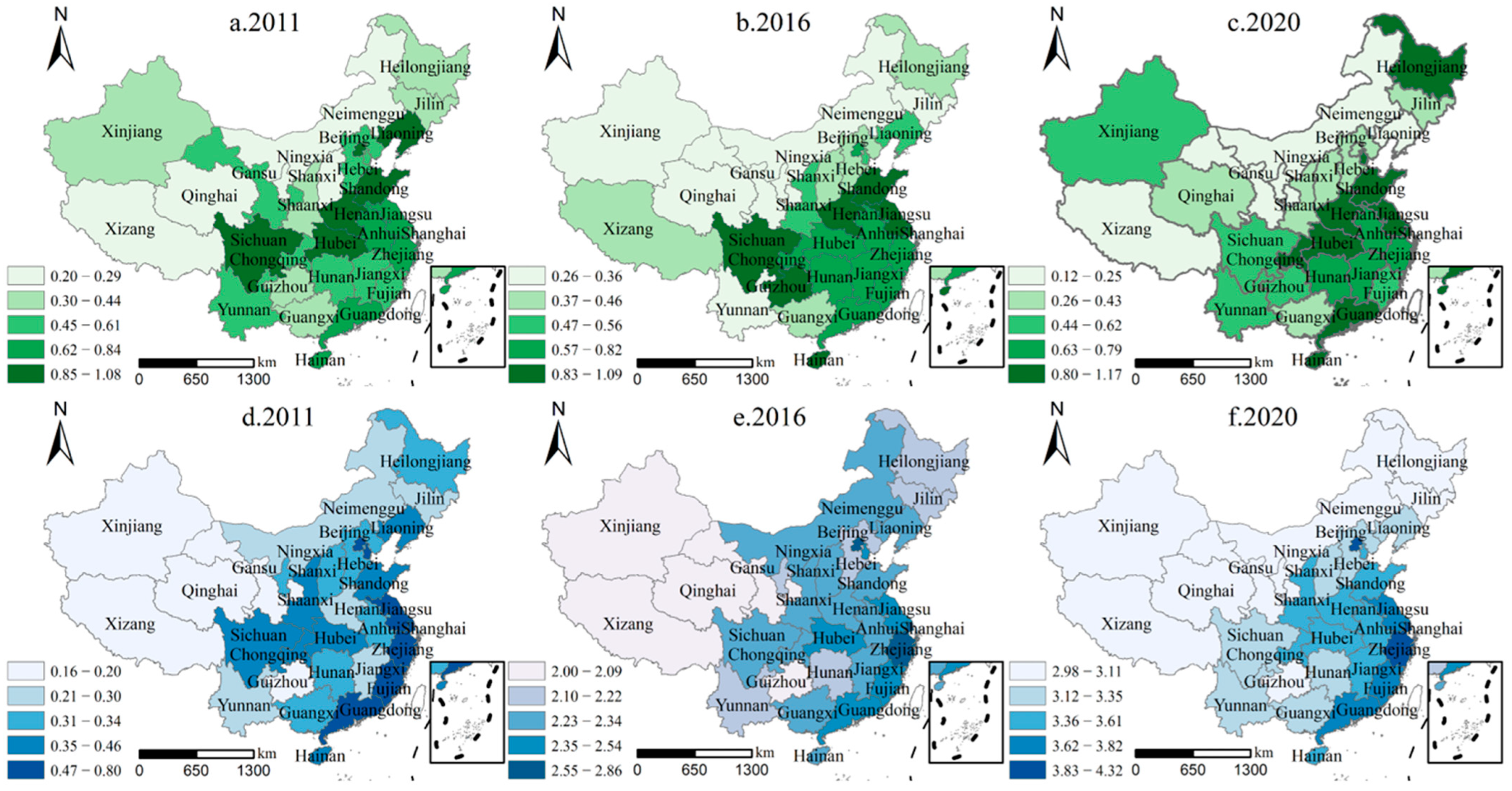 Digital finance in China evolved from highly concentrated hotspots in coastal megacities to broader regional diffusion (Figure 4d–f). In 2011, development was limited to major coastal cities. By 2016, digital finance expanded along key urban corridors and into inland provincial capitals. By 2020, a more widespread and integrated pattern emerged, although significant disparities persisted between urban centers and peripheral regions. This evolution reflects the combined effects of infrastructure expansion, policy initiatives, and market-driven innovation.