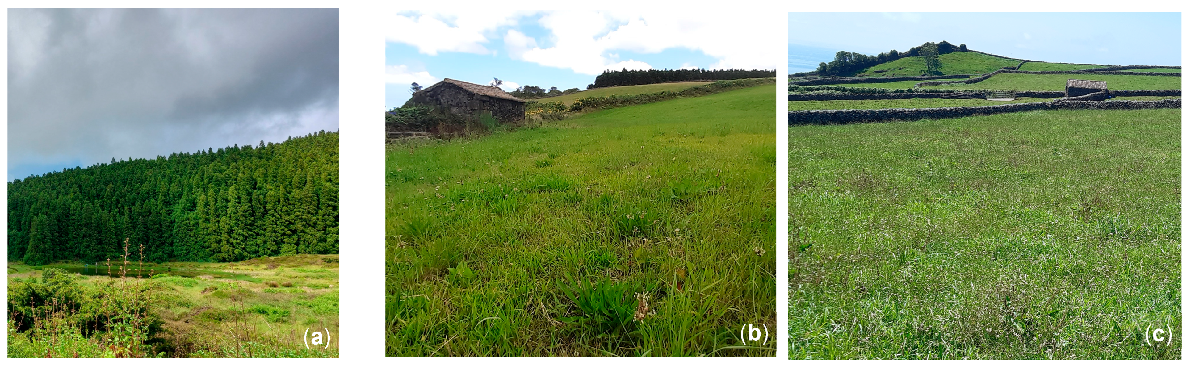 - Melo, C.D.; Walker, C.; Rodríguez-Echeverría, S.; Borges, P.A.V.; Freitas, H. Species composition of arbuscular mycorrhizal fungi differ in semi-natural and intensively managed pastures in an isolated oceanic island (Terceira, Azores). Symbiosis 2014, 64, 73–85. [Google Scholar] [CrossRef]