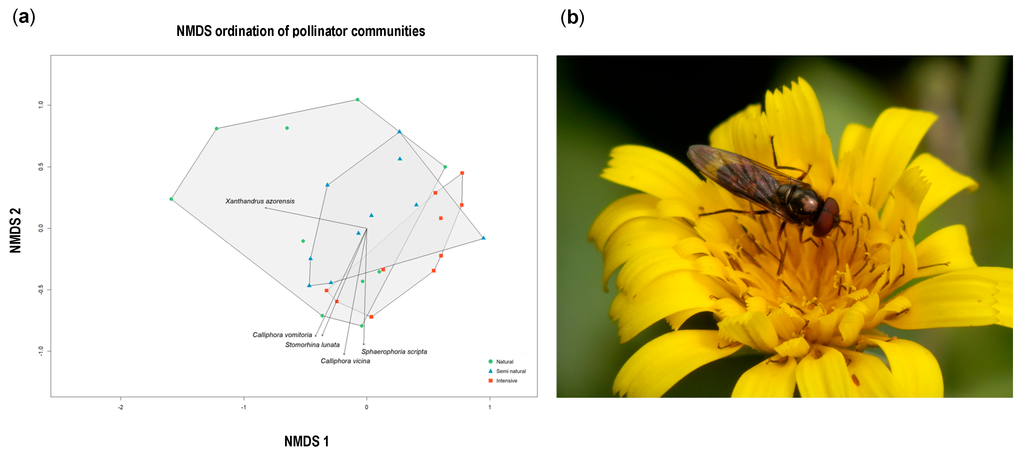 - Boieiro, M.; Oliveira, R.; Costa, R.; Borges, P.A.V. Pollinator species richness and abundance across diverse habitat-types on Terceira Island (Azores, Portugal). Biodivers. Data J. 2025, 13, e142482. [Google Scholar] [CrossRef]