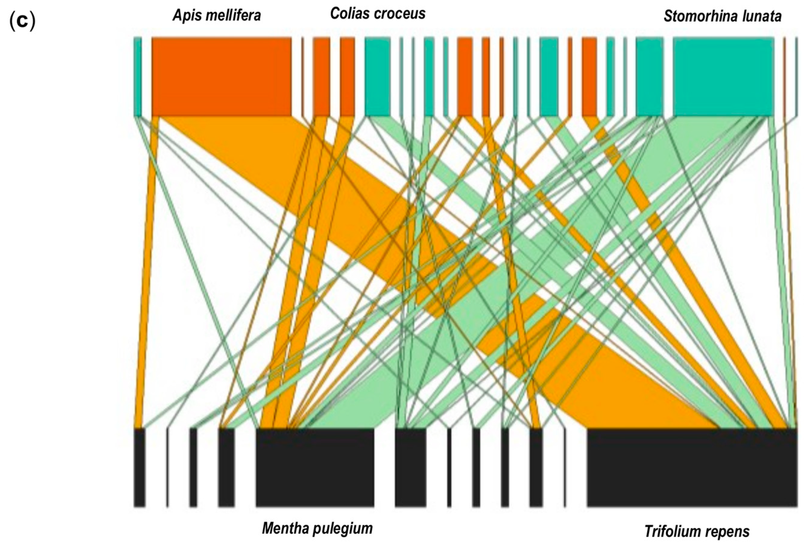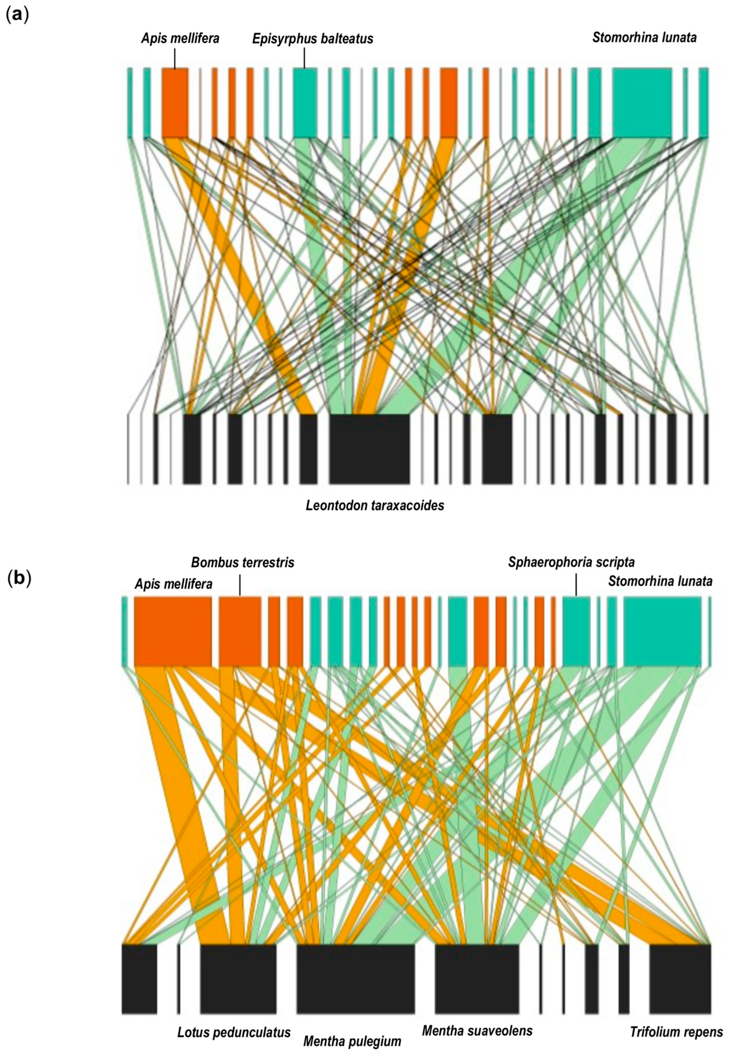 - Rakosy, D.; Motivans, E.; Ştefan, V.; Nowak, A.; Świerszcz, S.; Feldmann, R.; Kühn, E.; Geppert, C.; Venkataraman, N.; Sobieraj-Betlińska, A.; et al. Intensive grazing alters the diversity, composition and structure of plant-pollinator interaction networks in Central European grasslands. PLoS ONE 2022, 17, e0263576. [Google Scholar] [CrossRef] [PubMed]