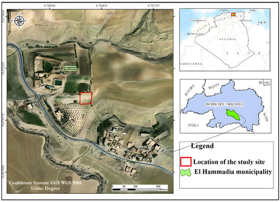 The study was conducted in the agricultural commune of El Hammadia, located in Bordj Bou Arreridj, in northeastern Algeria. The experimental site is located at 35°58′47″ North latitude and 4°44′51″ East longitude, at an altitude of 680 m above sea level (Figure 1). This region experiences a semi-arid climate, characterised by hot, dry summers and cool winters. The northeast of Algeria is subjected to very irregular spatio-temporal variation, rainfall varies faster toward the north/south direction [32]. Annual rainfall averages around 365 mm, with marked seasonal variations [33]. The soils in this area are predominantly calcareous, with a high carbonate content resulting from the weathering of limestone parent material.