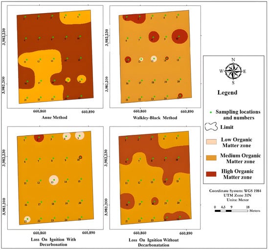 A spatial distribution map of SOM was developed to provide an overview of its distribution according to the different analytical methods used. The results obtained through spatial interpolation (Figure 5) show that the distribution of SOM varies depending on the method applied.