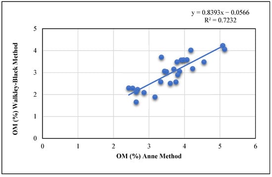 Correlation between the OM contents measured with the Anne method and OM contents measured by the Walkley–Black Method.