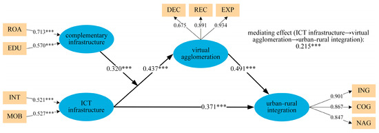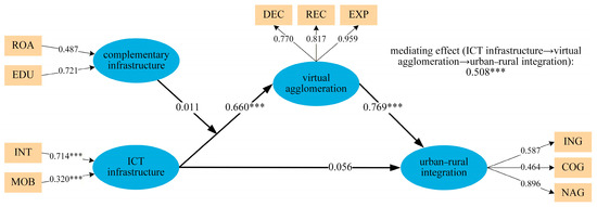 The baseline results are summarized in Figure 4. The direct relationship between ICT infrastructure and urban–rural integration (Hypothesis 1), the mediating role of virtual agglomeration (Hypothesis 2), and the moderating role of other complementary infrastructures (Hypothesis 3) are all tested.