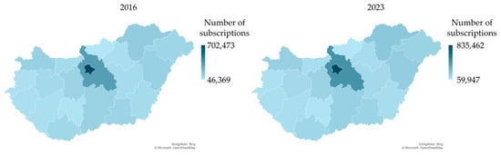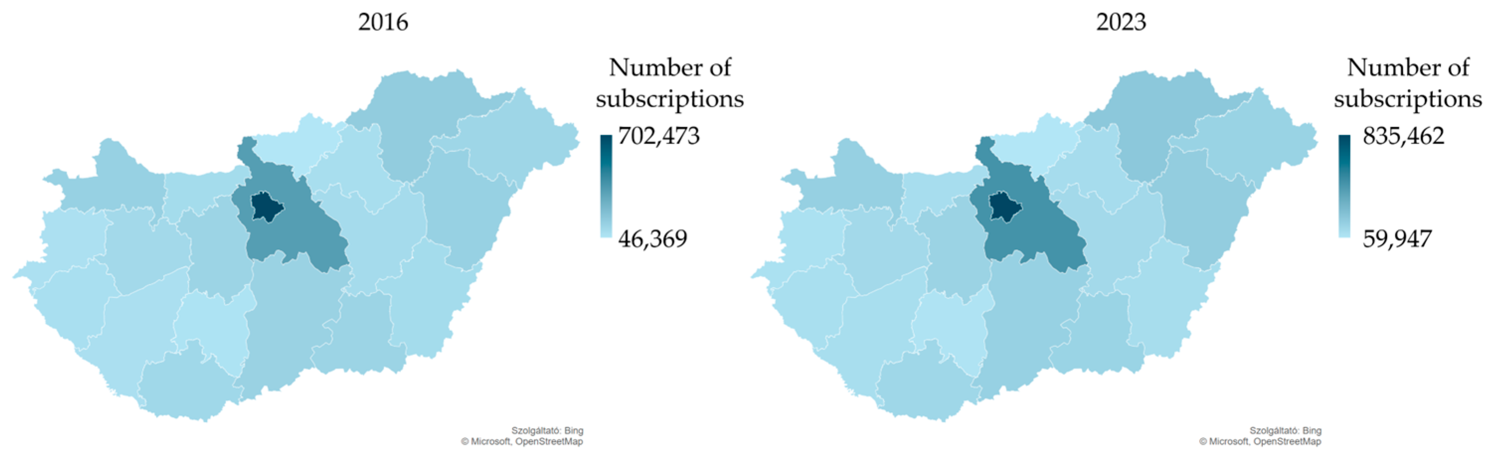 - HCSO. Helyhez Kötött Internetes Előfizetések Száma Kapcsolattípusonként Vármegye és Régió Szerint; Hungarian Central Statistical Office: Budapest, Hungary, 2025; Available online: https://www.ksh.hu/stadat_files/ikt/hu/ikt0025.html (accessed on 15 April 2025).