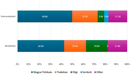 - Statista. Market Share of Service Providers Based on Fixed-Line Broadband Internet Subscriptions in Hungary as of 2nd Quarter 2024; Statista: Hamburg, Germany, 2025; Available online: https://www.statista.com/statistics/1184771/hungary-market-share-of-service-providers-based-on-fixed-broadband-internet-subscriptions/ (accessed on 15 April 2025).