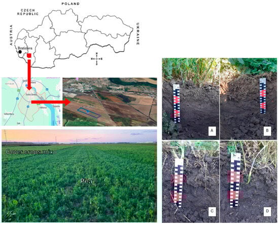 Location of the field experiment: (A) sandy loam soil with cover crop mixture; (B) sandy loam soil with pea as a cover crop; (C) silty clay loam soil with cover crop mixture; (D) silty clay loam soil with pea as a cover crop.