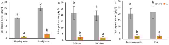 Soil organic matter. (A) Effect of soil texture, (B) soil depth, and (C) cover crops. Different letters between the same colour columns indicate statistically significant differences at p < 0.05.