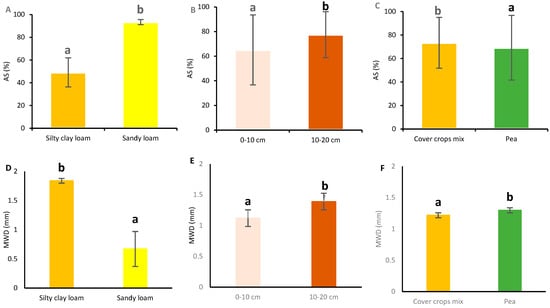 Aggregate stability (A–C) and mean weight diameter (D–F). Different letters indicate statistically significant differences at p < 0.05.