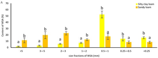The results indicate that aggregate stability (AS) and mean weight diameter (MWD) were strongly influenced by soil texture, soil depth, and cover crop type. Significant interactions among these factors were also observed (Table 3). The finding that AS and MWD were up to 90% and 174% higher, respectively, in silty clay loam soil than in sandy loam soil (Figure 3A,D) reflects the superior aggregation capacity and greater stability of soil aggregates in finer-textured soils []. Soils with higher clay content form stronger bonds with organic particles. In addition, these soils have a greater ability to retain water and nutrients, which support microbial activity and thereby enhances the biological stabilisation of aggregates [,].