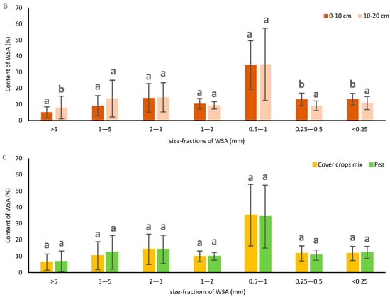 Contents of size-fractions of water-stable aggregates. (A) Effect of soil texture, (B) soil depth, and (C) cover crops. Different letters indicate statistically significant differences at p < 0.05.