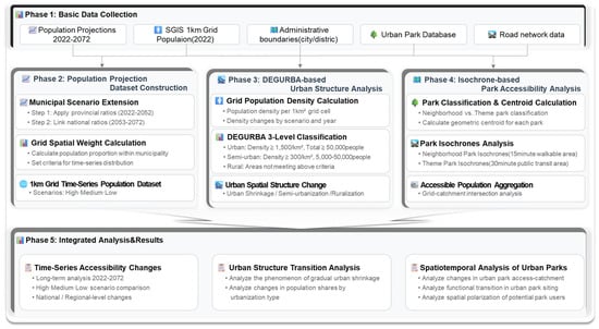 - Cen, L.; Xiao, Y. Assessing Urban Park Accessibility via Population Projections: Planning for Green Equity in Shanghai. Land 2025, 14, 1580. [Google Scholar] [CrossRef]