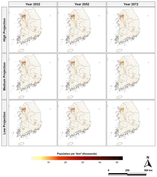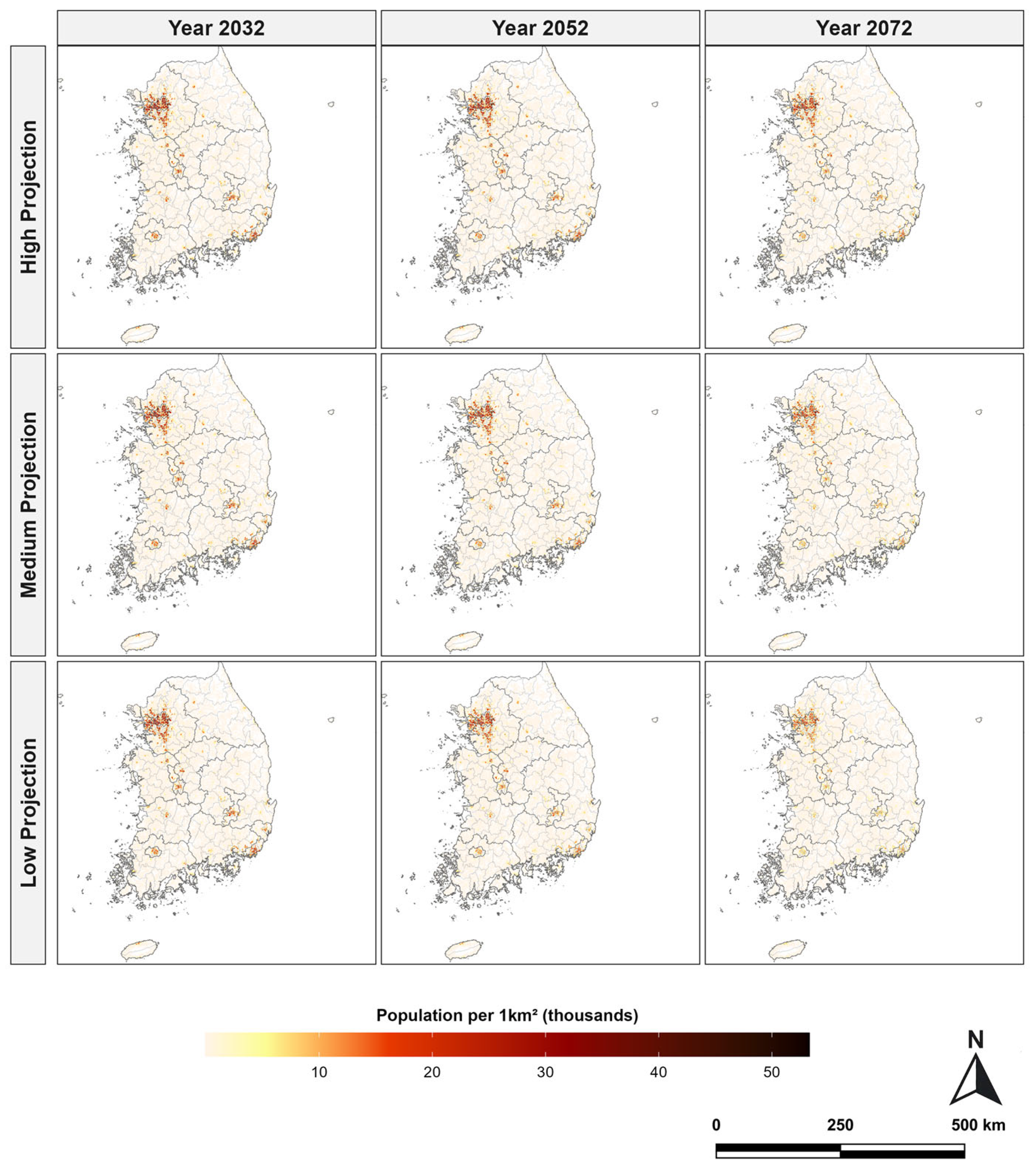 - Kim, S.; Lee, Y.; Oh, H. Estimation of Gridded Population with Spatial Downscaling in South Korea. Sustainability 2025, 17, 1511. [Google Scholar] [CrossRef]