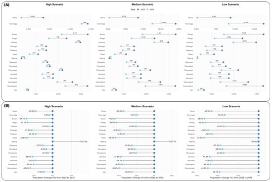 | Region | Scenario | 2022 Population (Thousand Persons) | 2032 (Change vs. 2022%) | 2042 (Change vs. 2022%) | 2052 (Change vs. 2022%) | 2062 (Change vs. 2022%) | 2072 (Change vs. 2022%) |