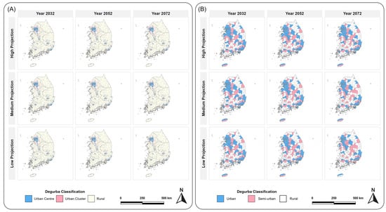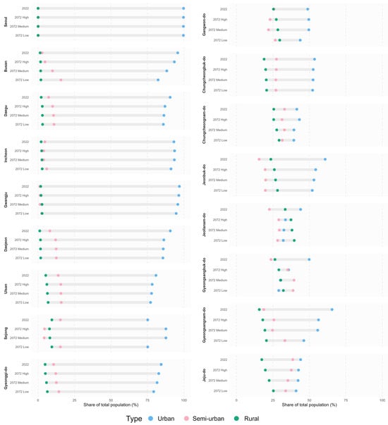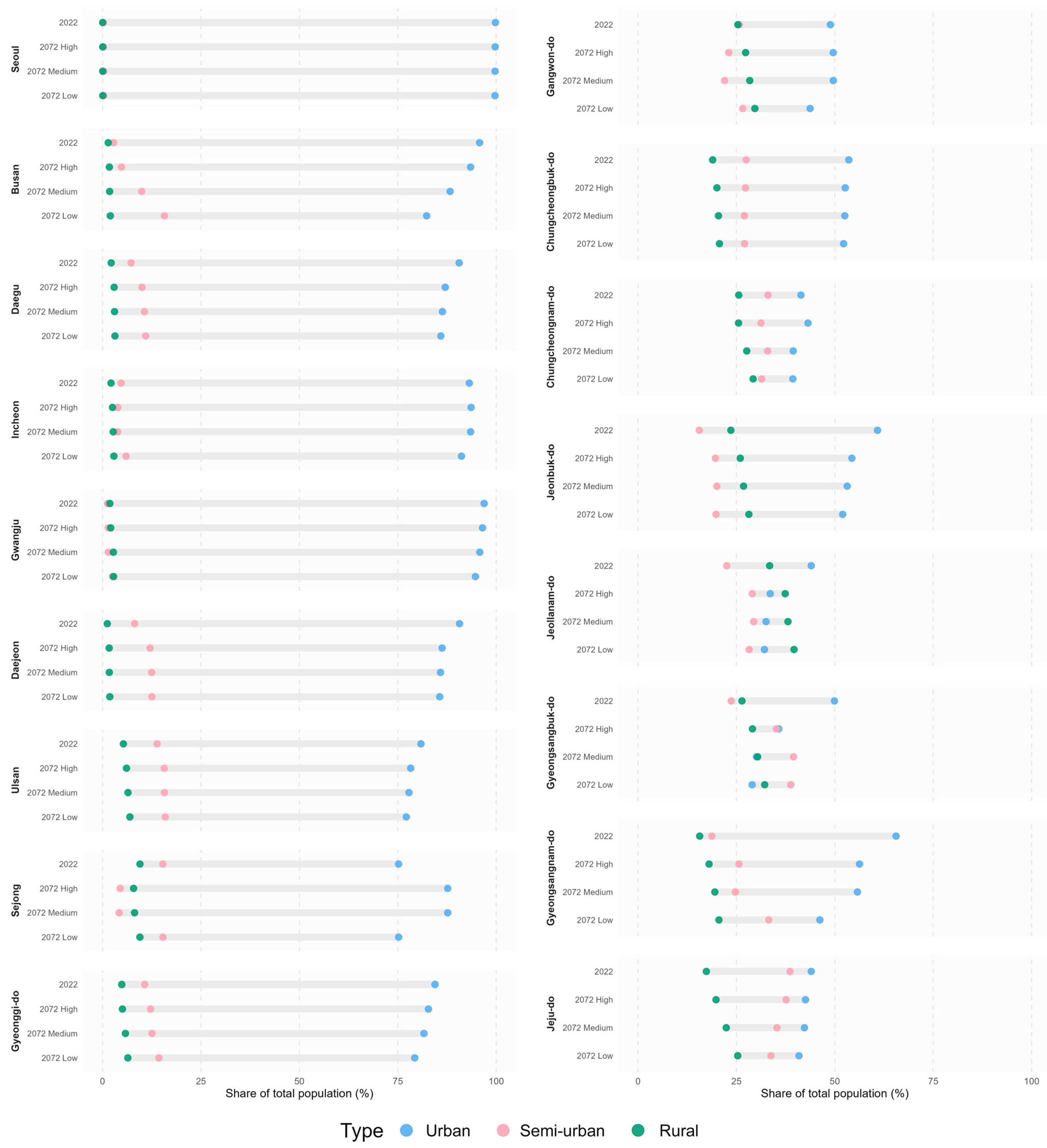 | Region | Urbanization Type | 2022 | 2072 (High Scenario) | 2072 (Medium Scenario) | 2072 (Low Scenario) | ||||||