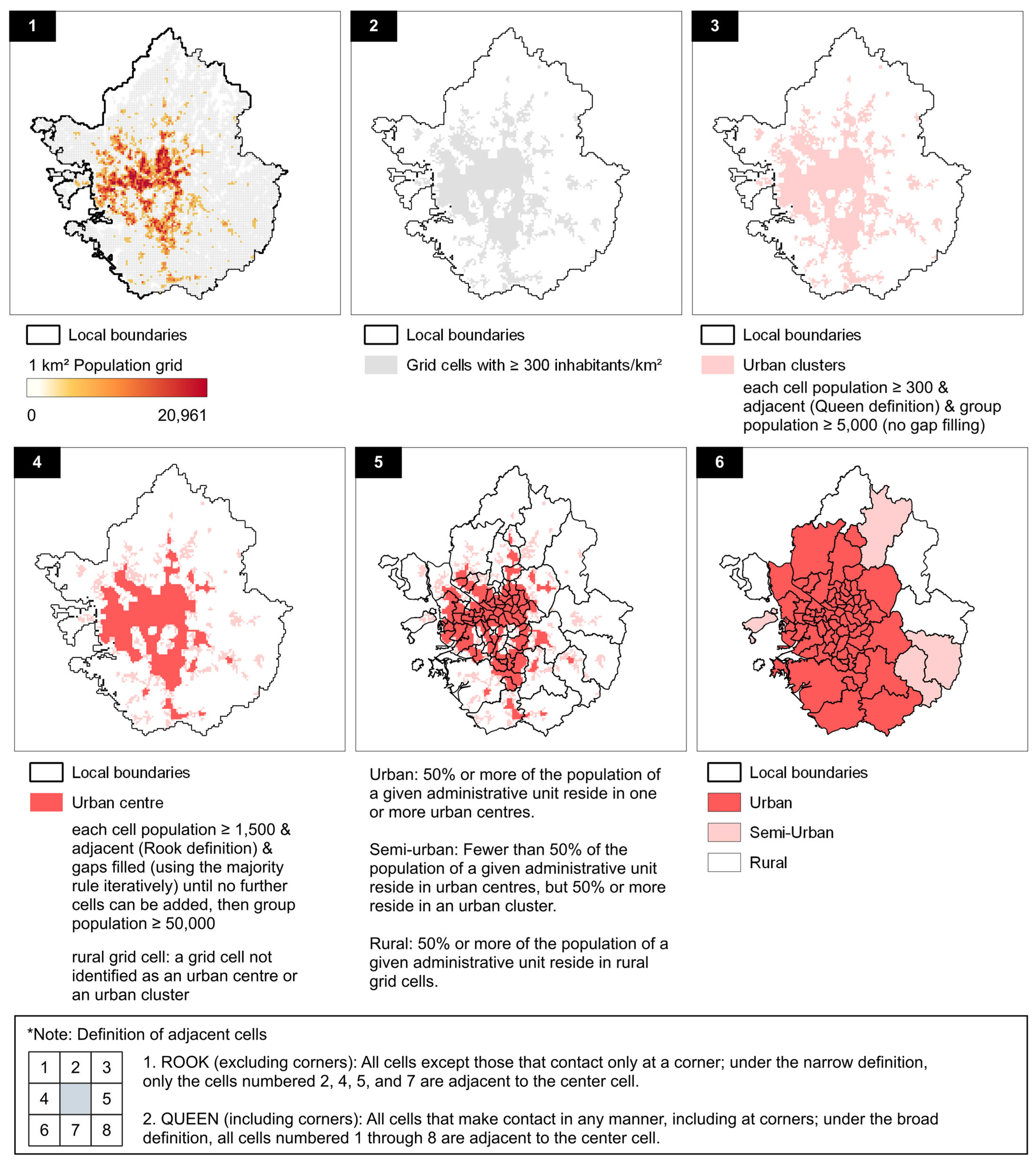 - Eurostat (European Commission). Applying the Degree of Urbanisation: A Methodological Manual to Define Cities, Towns and Rural Areas for International Comparisons, 2021th ed.; Publications Office of the European Union: Luxembourg, 2021; ISBN 978-92-76-20306-3. [Google Scholar]