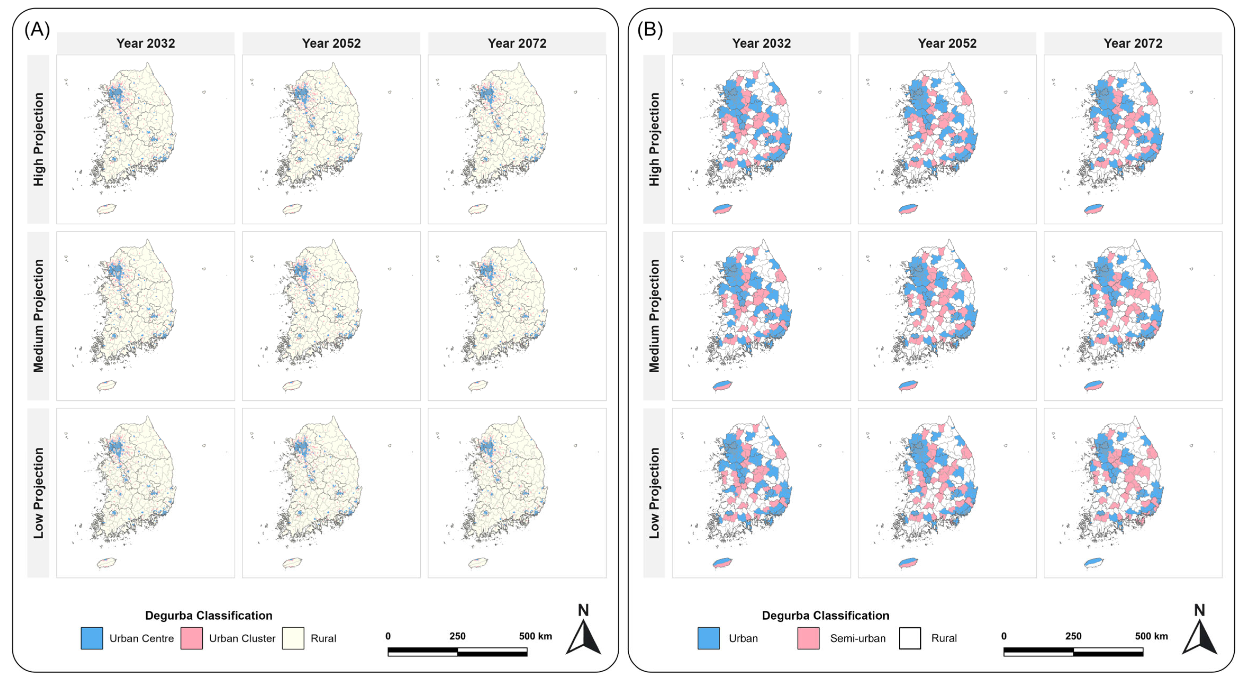| Population data | Statistics Korea (KOSIS) | Scenario-based future population projections at national/provincial/municipal levels | Grid time-series forecasting; baseline for DEGURBA model | 2022 | CSV |