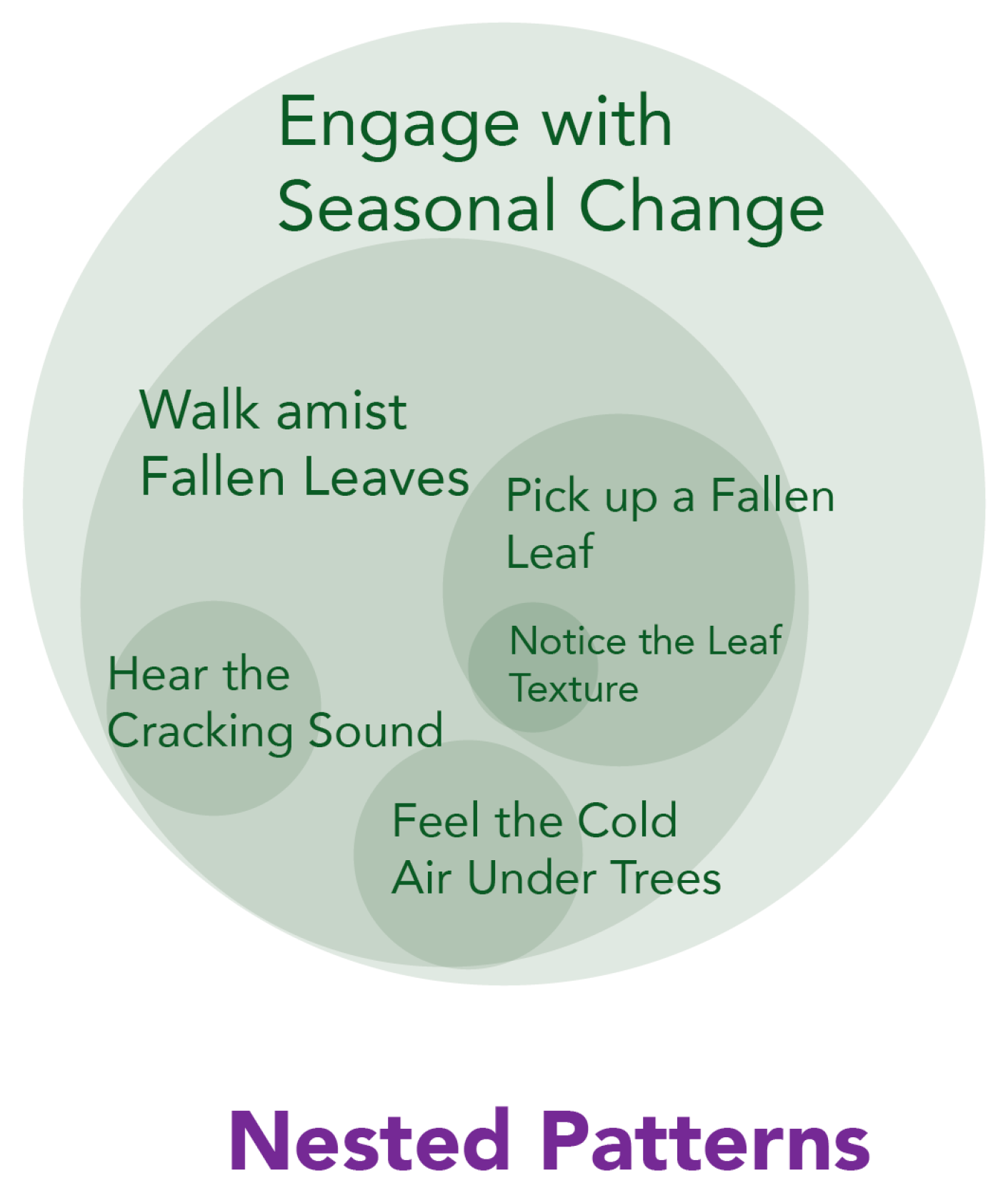 | Noticing Others in Nature | Moving in rhythm with others; sensing presence through shared view, sound, or motion | Vary path width for shared or solitary travel; position paths for overlapping visibility; provide access to ecological flows; restore ecological habitat |