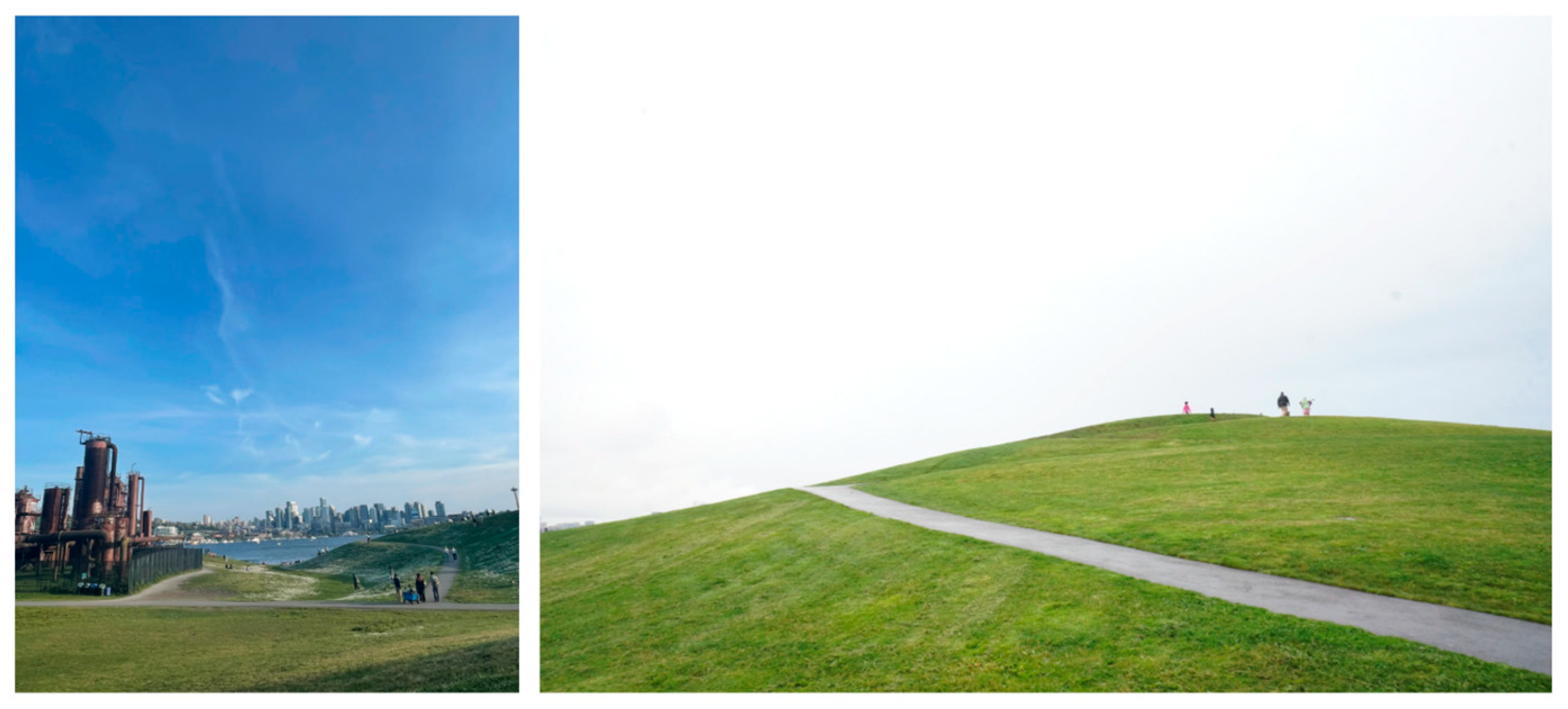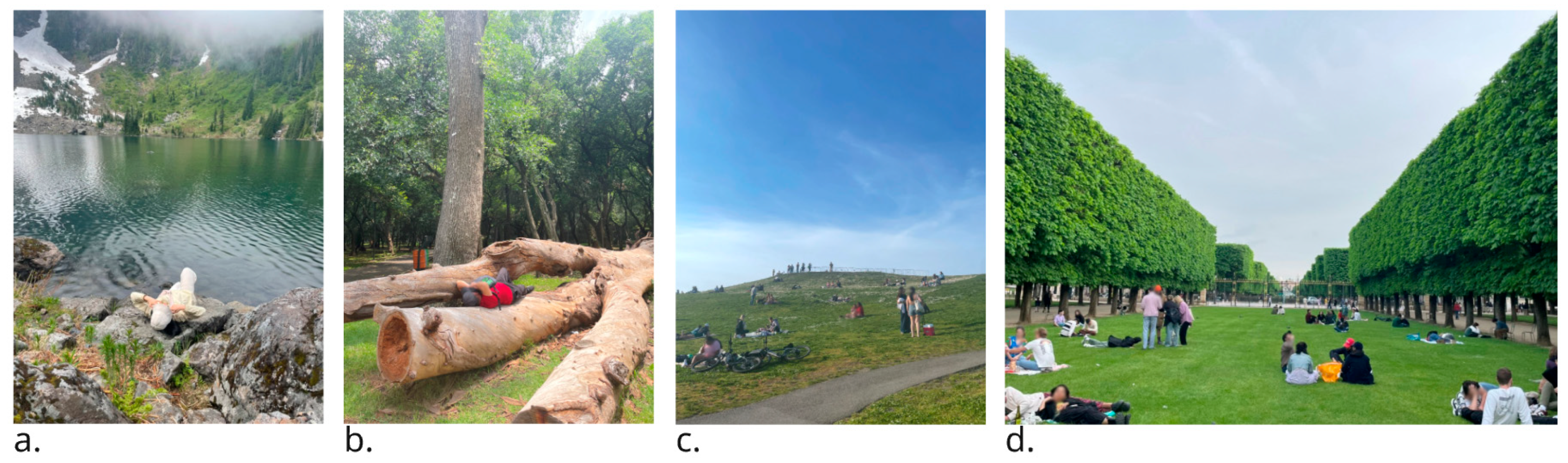 - Lev, E.; Kahn, P.H.; Chen, H.; Esperum, G. Relatively Wild Urban Parks Can Promote Human Resilience and Flourishing: A Case Study of Discovery Park, Seattle, Washington. Front. Sustain. Cities 2020, 2, 2. [Google Scholar] [CrossRef]