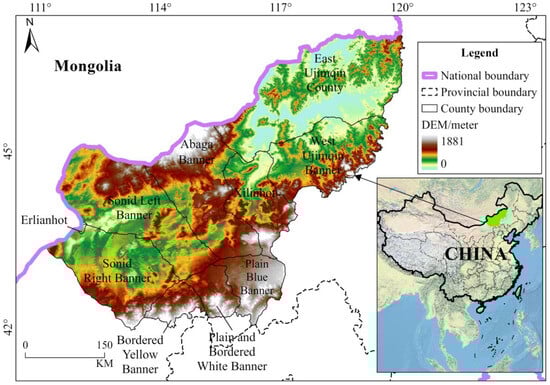 Xilingol League (Figure 1) is located in central Inner Mongolia Autonomous Region, between 42°32′–46°41′ N and 111°59′–120°00′ E. The administrative area covers approximately 202,600 km2, with an average elevation above 1000 m and relatively abundant mineral resources. Grasslands dominate the landscape: meadow steppe, typical steppe, desert steppe, sandy vegetation and other grasslands together account for 87.12% of the League’s area. In 2024, the League’s gross domestic product (GDP) reached RMB 123.596 billion and the permanent resident population was 1,112,500, with an urbanization rate of 76.38%. Located within regions of both national energy security and ecological-security significance, the League has experienced marked changes in its human settlement environment driven by industrialization and urbanization; it is also characterized by frequent droughts and snow disasters, fragile ecosystems, and a relatively underdeveloped economy.