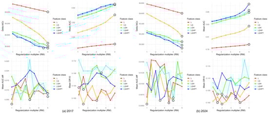 Among them, the LQHPT combination with RM = 5 demonstrated the best performance across multiple key metrics. The mean AUC values for 2017 and 2024 reached approximately 0.845 and 0.865, respectively, representing the highest values among all combinations. The AUC difference (AUC diff) remained low in both years (<0.012), suggesting that overfitting was effectively controlled. The OR10 metric in 2024 reached a minimum of 0.1, indicating superior predictive ability compared to 2017, with relatively minor fluctuations.