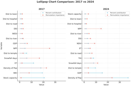The temporal variation in variable importance is closely associated with socioeconomic development, adjustments in grassland utilization, and fluctuations in the climatic environment. In 2017, ecological and hydrological indicators such as “stock capacity” and the “ET” exhibited higher importance, suggesting that during the stage when grassland husbandry was predominant, ecological constraints played a decisive role in shaping settlement spatial patterns. Over time, by 2024, socioeconomic factors such as “population density” and “GDP” gained substantial importance, reflecting that under the backdrop of rapid urbanization, infrastructure expansion, and the enhancement of service functions, socioeconomic forces gradually emerged as the primary drivers of settlement distribution. Meanwhile, the relative decline in the importance of natural factors indicates that human activities have, to some extent, alleviated or substituted the dependence on environmental conditions. Consequently, the determinants of settlement suitability have shifted from ecological–resource constraints to socioeconomic drivers, highlighting a transformation from environmental determinism toward socioeconomic dominance in the evolution of pastoral settlements. This transition not only reflects the coupled interactions between natural and human systems but also underscores the profound influence of regional development policies and economic restructuring on the spatial evolution of settlements. These changes also illustrate the spatial transition of suitable human settlement areas from pastoral regions to cities and towns.