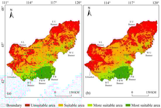 In the MaxEnt model, future human settlement suitability zones can also be predicted. Based on the prediction results, the spatial distribution of various suitability categories was analyzed, and the areas of each suitability level within different banners and counties were calculated. Combined with statistical data, these results provide insights into future human settlement suitability, offering theoretical support for promoting spatial reconstruction in the pastoral areas of Xilingol League.