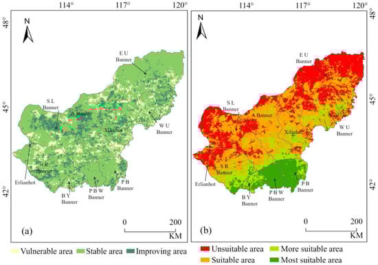 where X represents the dynamic intensity, denotes the time span, and X2017/2024 refers to the human settlement suitability results. This method illustrates whether the pastoral human settlement environment in Xilingol League has evolved toward improvement or deterioration, and clearly reveals its spatial distribution. The resulting map was classified into three categories—vulnerable areas, stable areas, and improved areas—using the natural breaks (Jenks) method, reflecting different levels of dynamic change.