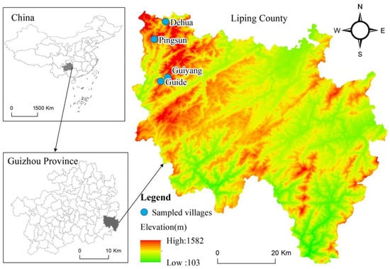 Liping County in the Guizhou province (Figure 1) is situated at 108°31′~109°3′ E and 25°41′~26°08′ N. It is located at the junction of the Guizhou, Hunan, and Guangxi provinces (regions), and is the transition area from the Yunnan–Guizhou Plateau to Jiangnan Hills. It has the characteristics of a south subtropical monsoon climate, with an average annual temperature of 16.2 °C and an annual precipitation of 1235 mm. All over the territory, there are mainly low mountains, low mountain canyons, low hills, and other geomorphic types; the average altitude is about 695 m. Liping County has favorable climatic conditions for the development of agriculture, and the proportion of the agricultural economy is relatively large. However, the relatively backward economy forces more and more rural populations to continuously flow out, and the phenomenon of CA continues to emerge with a growing trend. It is of practical significance to study the CA behavior of farming households in this region.