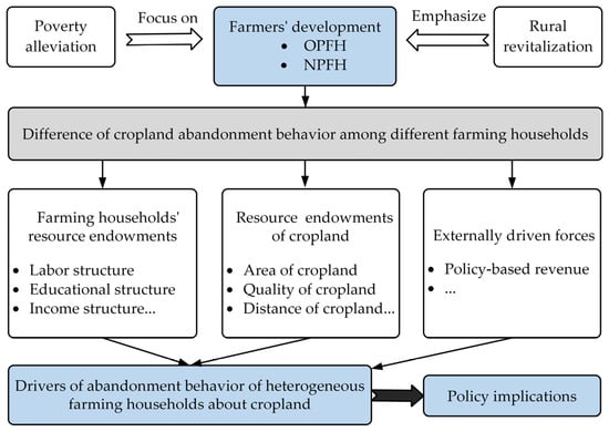 Compared with the established literature, at this stage, there is a lack of comparative research on CA from a heterogeneous perspective that focuses on the large number of farming households that are unique in nature but have been lifted out of poverty. Therefore, this manuscript attempts to compare the specific component of out-of-poverty farming households (OPFHs) with the majority group of non-poverty farming households (NPFHs). The classification of these two types of farming households is based on clear criteria for defining poverty scope specified in national policies [,]. Specifically, OPFHs refer to those that were once included in the registered poverty list, later achieved poverty alleviation standards through poverty alleviation policy support or their development, and stably exited the poverty sequence []. In contrast, NPFHs refer to farming households that have never been included in the registered poverty list, whose income levels and living conditions have long remained above the poverty line, and who have not received support from major targeted poverty alleviation policies. A comprehensive analytical framework that incorporates the core elements of rural poor farming households and land use is constructed from the perspective of land use, which then analyzes the differences between farmer-level and land-level factors in the two types of farming households’ CA behaviors, as well as the significant factors influencing farming households’ abandonment behaviors. It is expected that the study will help to enhance the endogenous motivation of rural people coming out of poverty and optimize the basis of rural land structure. It also provides new references and experience samples for other countries and regions to enhance the development capacity of farming households and optimize the use of cropland.