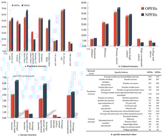 As the main decision maker and fundamental unit of cropland utilization, the characteristics of farming households’ members have an interaction effect on CA []. As farmers change from high self-similarity to complex heterogeneity, their CA behavior will also take on complex features []. Therefore, according to the national policy documents and the standard of poor households established by the governments, this standard is mainly based on the income of farming households as a reference. In the study, we used the registered impoverished families who came out of poverty and those who were not poor as the different types of farming households. Exploring the characteristics of different farming households is the foundation and prerequisite to deeply understanding the differences in their CA behavior. With regard to the existing research results [,], this paper will analyze the differences in the basic characteristics of two types of farming households based on population structure, cultural structure, and income structure (see Figure 3 for specific indicators).