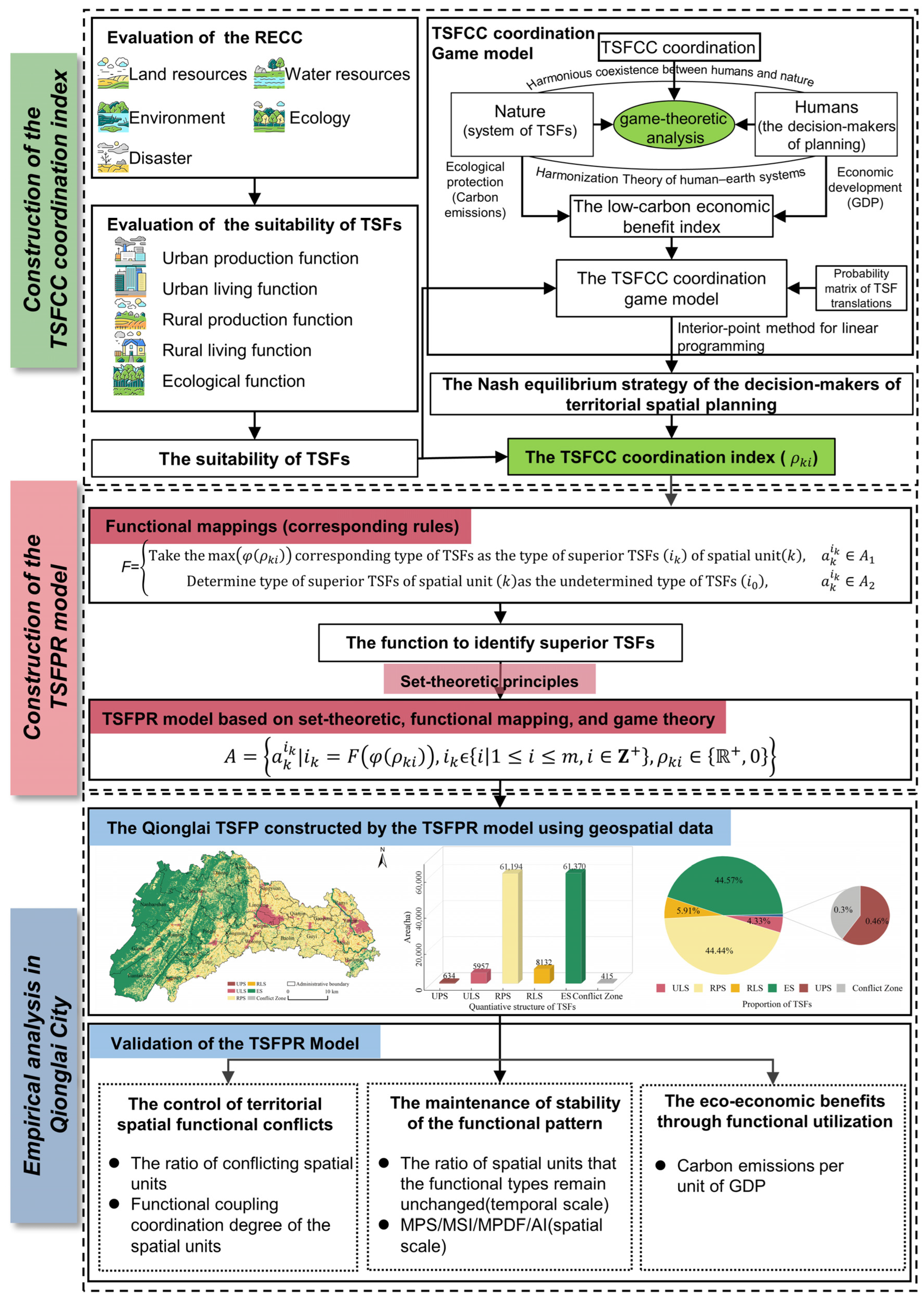 Ou, D.; Cheng, X.; Yan, Z.; Ruan, K.; Huang, Q.; Zhao, Z.; Yang, Z.; Qin, J.; Xia, J. Territorial Functional Pattern Reconstruction Integrating Set-Theoretic and Functional Mappings with Game-Theoretic Analysis to Reconcile Development and Conservation in China. Land 2025, 14, 2060. https://doi.org/10.3390/land14102060