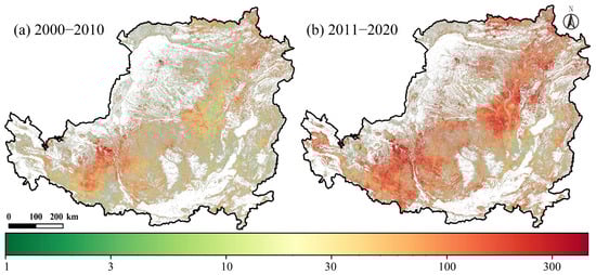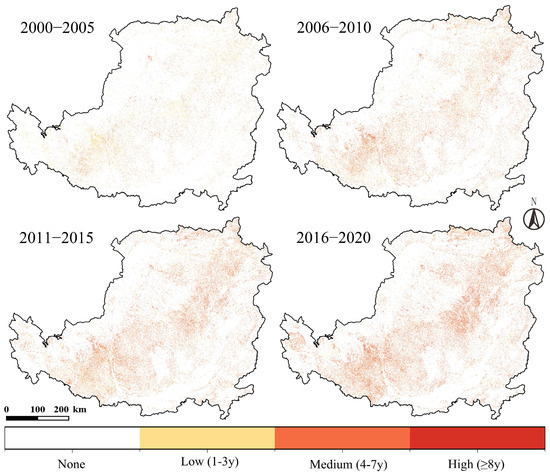- Multiyear abandonment grade distribution—Based on the entire period of 2000–2020. Pixels were classified into low, medium, and high-grade abandonment according to their cumulative duration of abandonment.