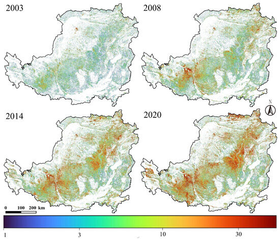 Between 2000 and 2020, CA on the Loess Plateau exhibited a gradual transition from scattered to clustered distribution and from short-term to long-term persistence. Overall, the abandoned area was approximately 2.72 million ha during 2000–2005, dominated by low-grade abandonment (1–3 years, 63%), and distributed in a relatively dispersed manner. From 2006 onward, abandonment expanded rapidly, reaching 4.66 million ha in 2010. During 2011–2015, the abandoned area further increased to 6.02 million ha, accompanied by a rising proportion of high-grade abandonment. By 2016–2020, abandonment stabilized at 6.96 million ha, with long-term abandonment (≥4 years) exceeding 75%, indicating a trend toward deeper and more persistent land-use change.