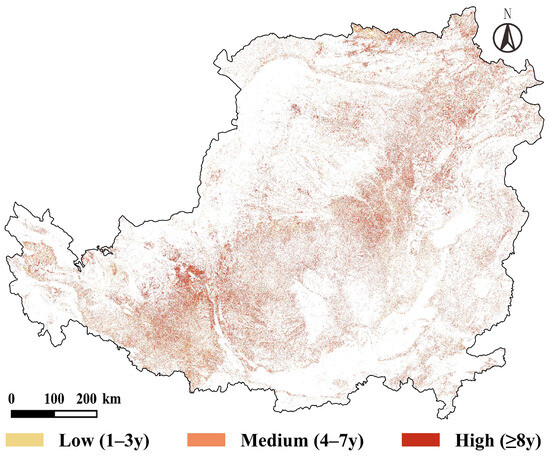 There is currently no consensus on the temporal threshold used to define cropland abandonment. International organizations such as the FAO (Food and Agriculture Organization of the United Nations) commonly set a longer duration (≥5 years), while recent studies in China have adopted shorter thresholds ranging from 1 to 3 years [7,43]. Drawing on these definitions and to capture both short-term and prolonged discontinuities of cultivation, this study classified multiyear abandonment into three levels: low (1–3 years), medium (4–7 years), and high (≥8 years).
