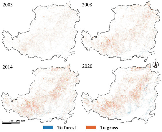 Conversion of cropland to forest or grassland refers to the process in which CA is stably transformed into forest or grassland, representing a major policy-driven land-use transition. In this study, pixels within the multiyear abandonment trajectories that ultimately transitioned into forest or grassland were identified and classified as “conversion to forest” and “conversion to grassland,” respectively.