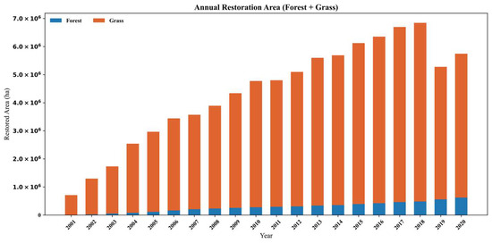 In terms of annual dynamics, the area of converted cropland increased continuously between 2000 and 2010, peaking at approximately 3.4 million ha in 2018. Although it declined slightly thereafter, it remained above 3.0 million ha overall (Figure 8). Grassland restoration consistently accounted for about 80% of the total in the early years, reflecting the shorter subsidy period (2 years) and lower cost of establishing grass cover under the initial GFGP scheme. By contrast, forest restoration—supported by extended subsidy years (up to 8 years) and higher payment standards in later stages—expanded steadily after 2006, reaching nearly 0.53 million ha in 2020, several times higher than in 2001.