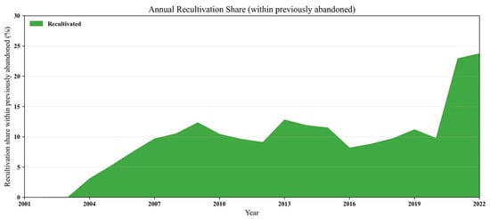 Cropland reclamation is defined as the process by which previously abandoned pixels are re-converted to cropland (0 → 1). To avoid misclassification caused by short-term noise, reclamation was only considered valid if the cropland status persisted for more than one year following the conversion. The first year in which a pixel transitioned from non-cropland (0) back to cropland (1) was recorded as the reclamation year. This rule enables the identification of cropland recovery resulting from policy incentives or farmers’ land-use decisions.
